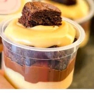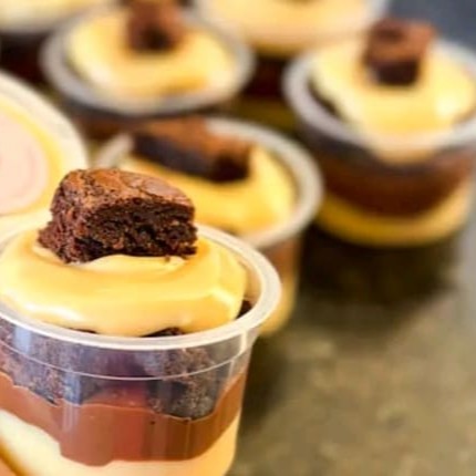 """A perfeita combinação do brigadeiro 50% cacau super cremoso, recheio de maracujá e nosso delicioso brownie."""