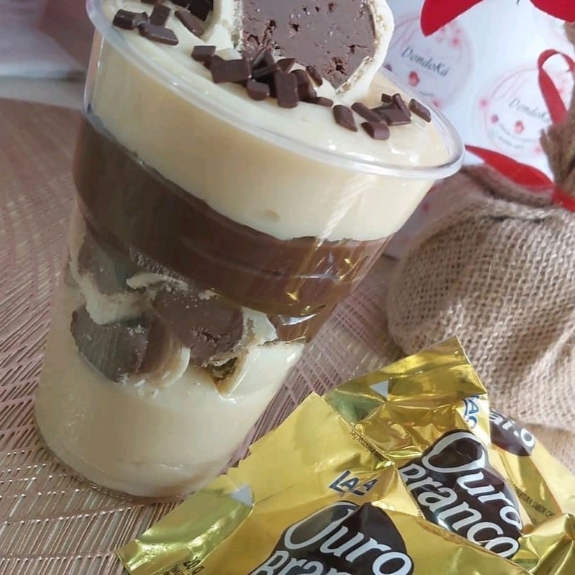 """Irresistível copo da felicidade - Sabor Ouro Branco, camadas dr brigadeiro branco cremoso, brigadeiro 50% cacau e generosos pedaços de bombom Ouro Branco. 250ml de pura felicidade m cada colherada"""