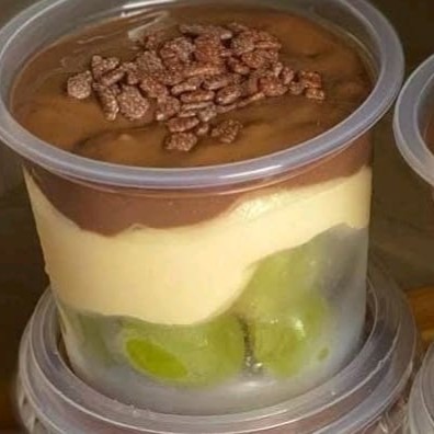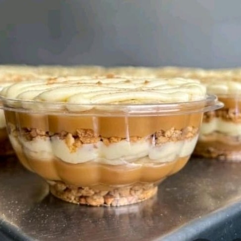 """Banoffee dos sonhos! Camadas irresistíveis de farofa crocante de biscoito, doce de leite caseiro, bananas caramelizadas e um suave creme branco que derrete na boca, finalizado com um toque de canela. """