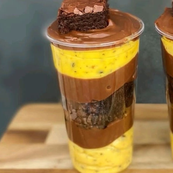 """Irresistível brigadeiro cremoso de maracujá, com camada de brownie, finalizado com um delicioso e cremoso brigadeiro de chocolate. Sabor perfeito em cada colherada!"""