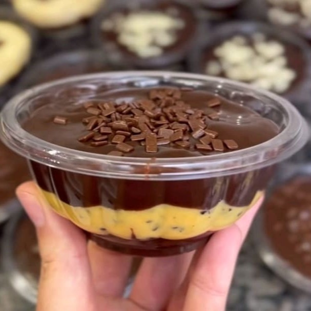 Uma combinação irresistível: cremoso brigadeiro artesanal feito com cacau 50%, equilibrando doçura e intensidade, harmonizado com pedaços macios de brownie fresquinho. Servido no pote de 145 ml, é a sobremesa perfeita para saborear devagar ou se entregar de vez. Finalização especial para conquistar no primeiro olhar — e no último pedaço.