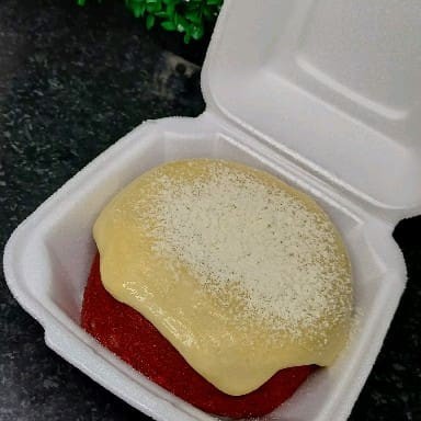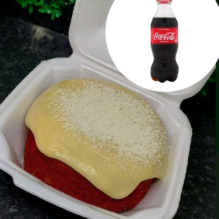 Nesse combo você leva o bolo red velvet com cobertura de Ninho+Coca cola em lata 250ml