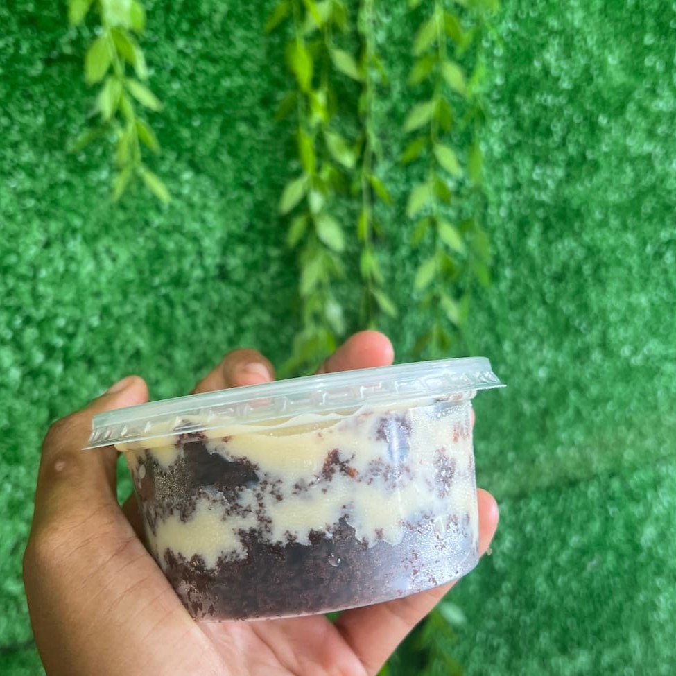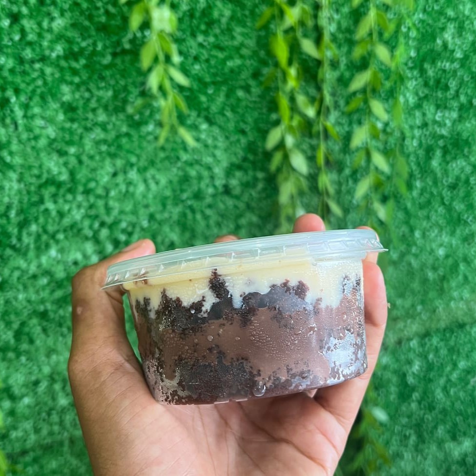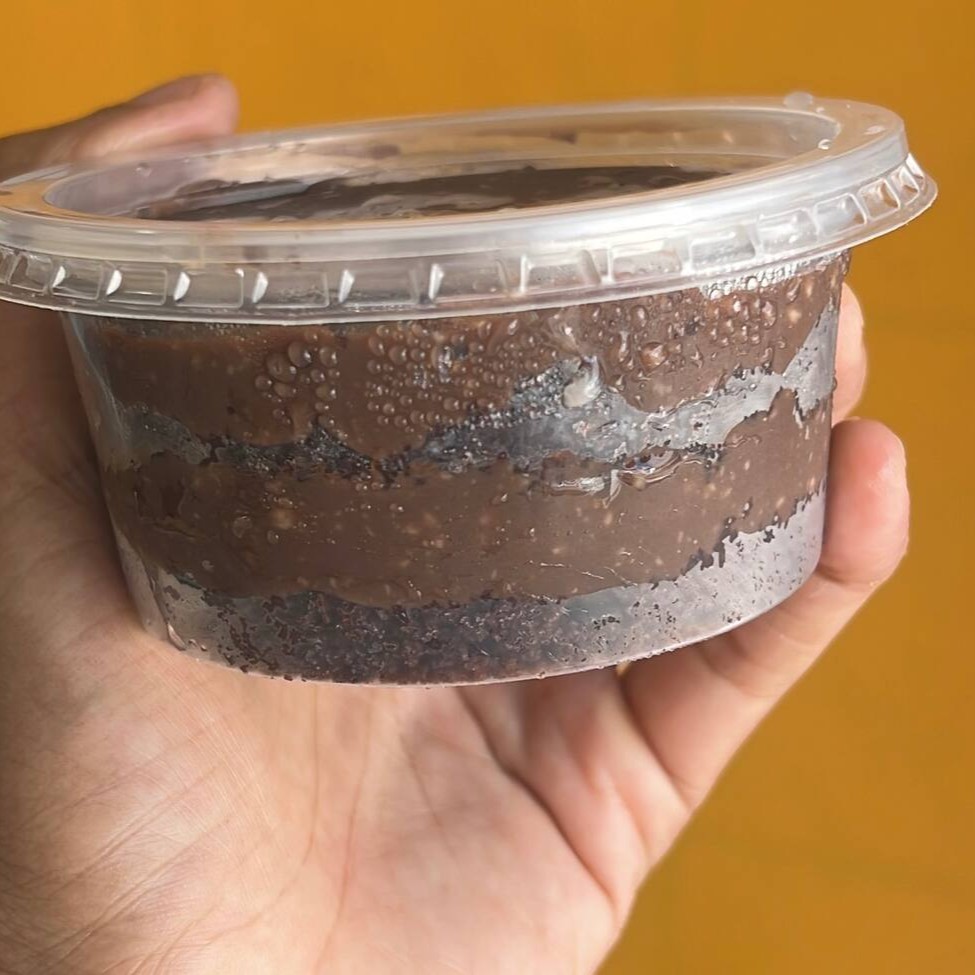 Delicioso bolo de pote com massa de chocolate 50% cacau, recheado com nosso brigadeiro tradicional e brigadeiro de Ninho