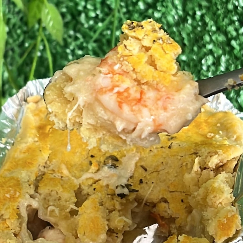 Deliciosa torta individual 200g com massa amanteigada, recheada com camarão fresco e temperado e finalizado com queijo mussarela