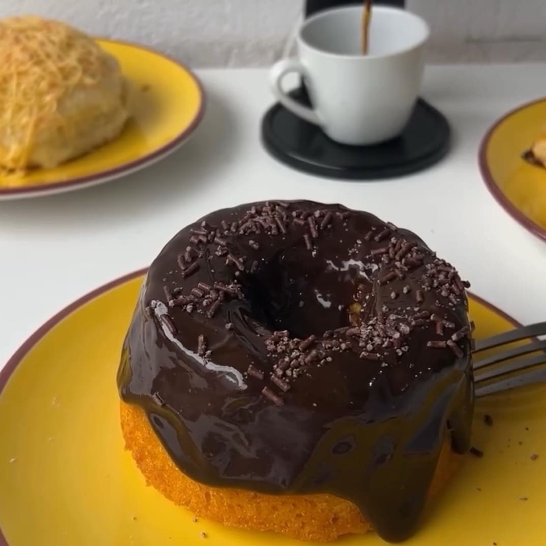 um bolo de pote chocolatudo + uma coxinha de frango tradicional e um refri em lata