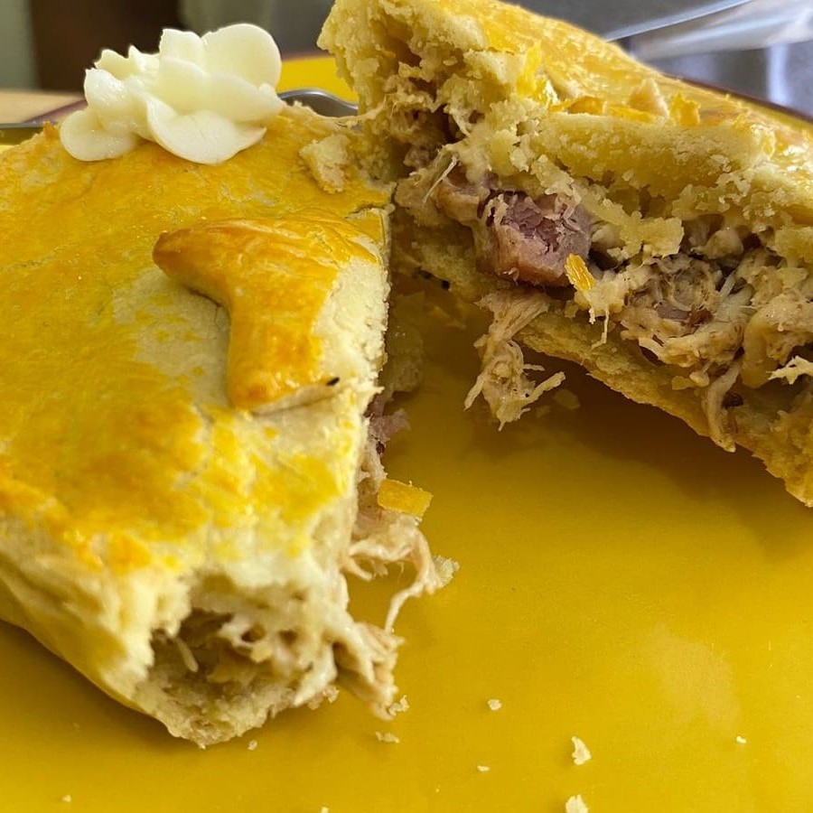 delicioso salgado com massa de batata, recheado de queijo, presunto, calabresa, frango, milho e oregano