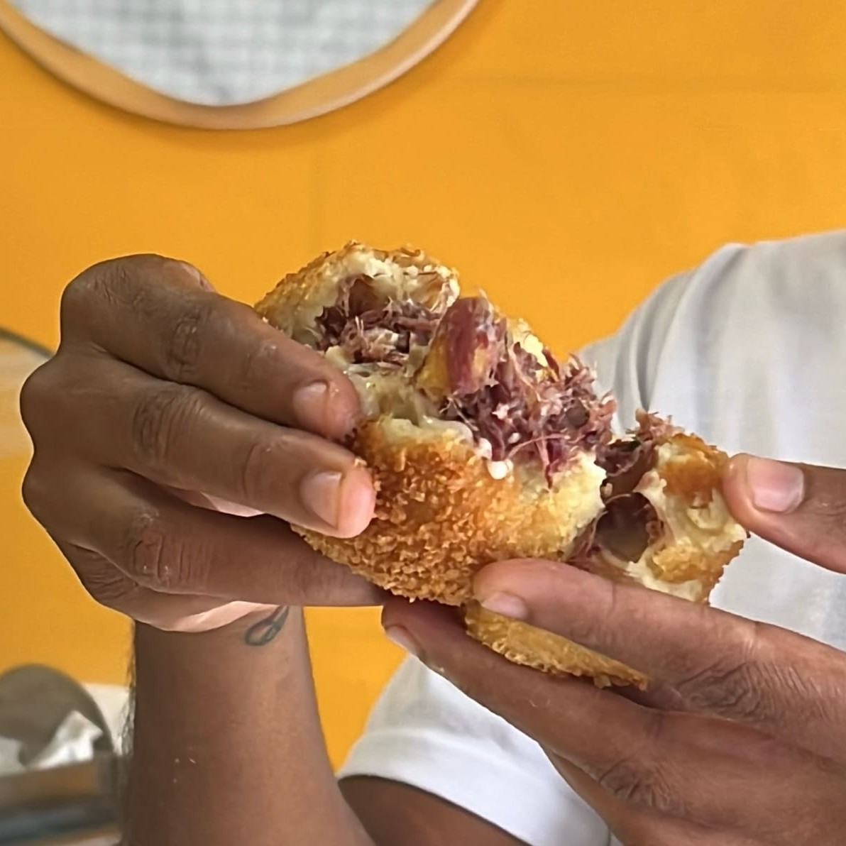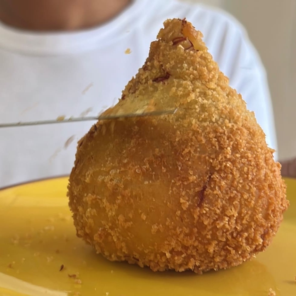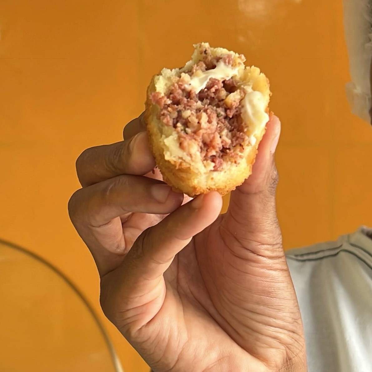 Delicioso croquete com massa de batata, recheado com calabresa refogada e queijo provolone