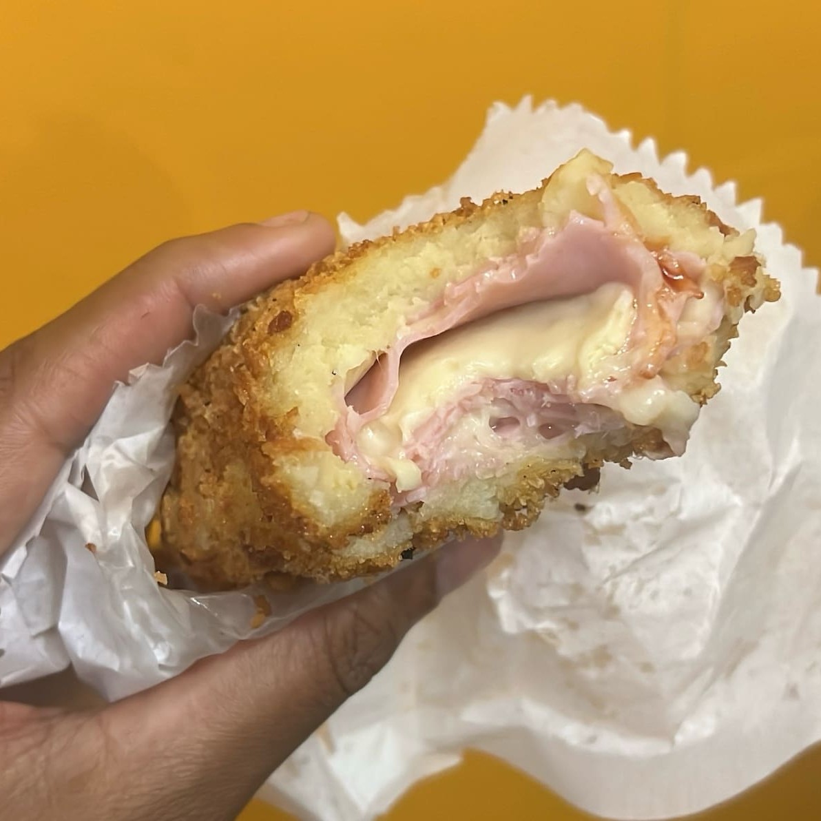 Deliciosa massa de batata, super recheada de camadas de queijo e presunto, empanada com panko