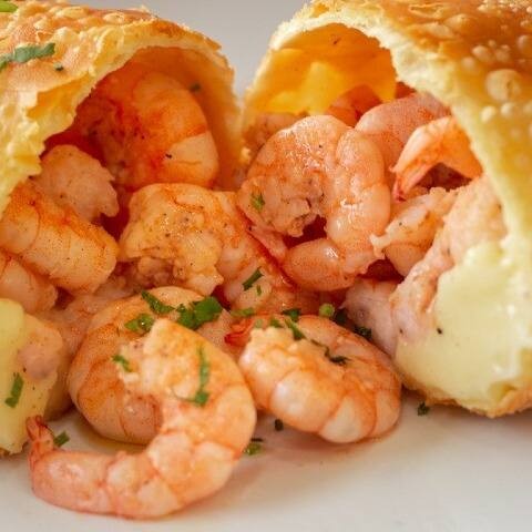 Camarão, catupiry, pasta de camarão e aquela deliciosa massa crocante