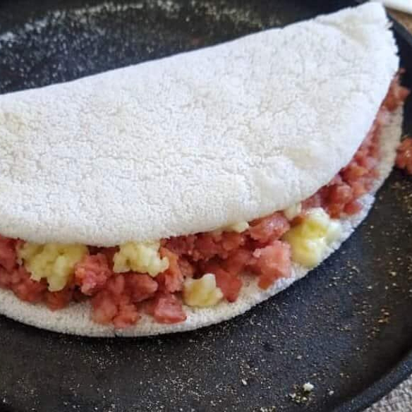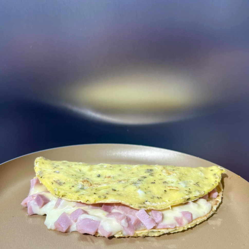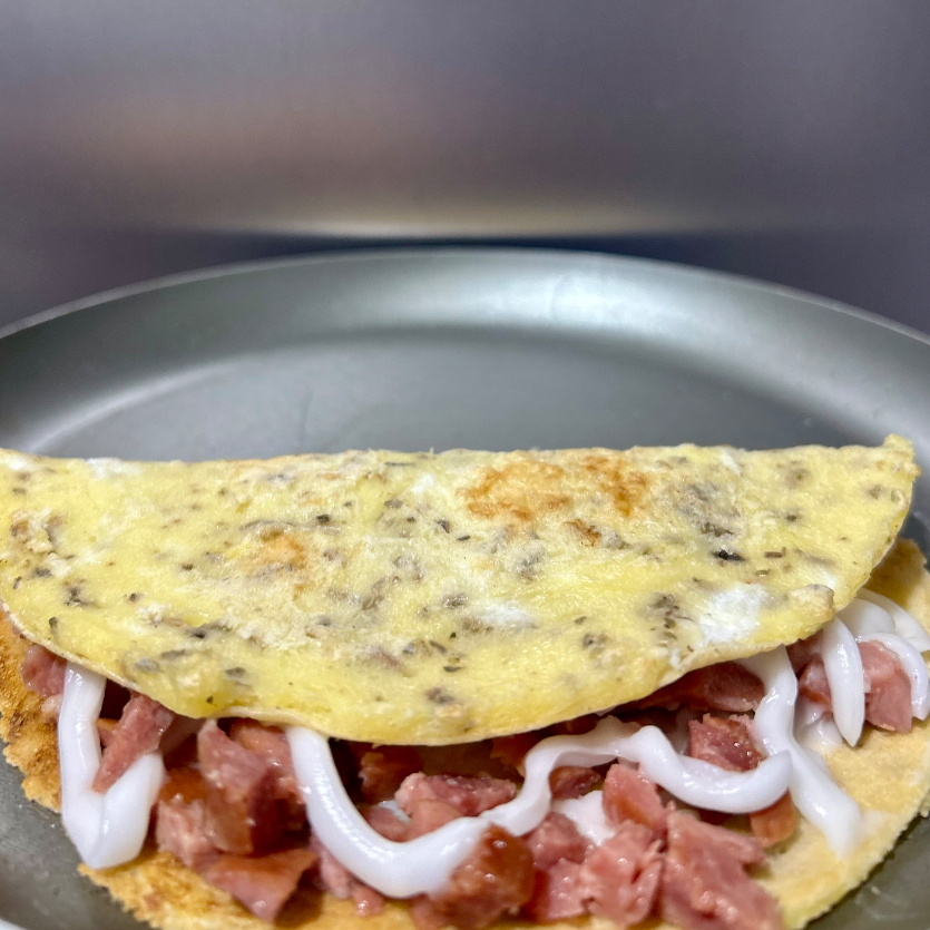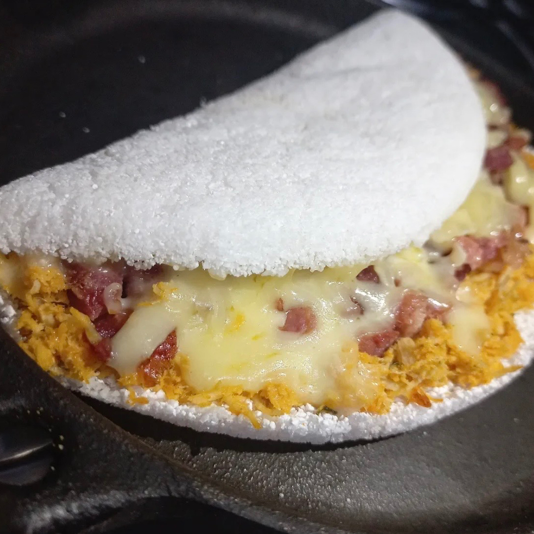 Tapioca de calabresa,queijo,azeitona,tomate,cebola e orégano.