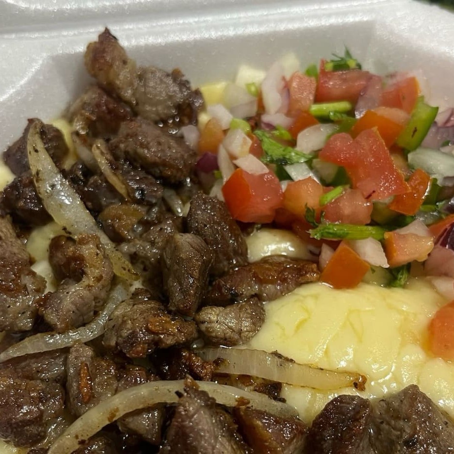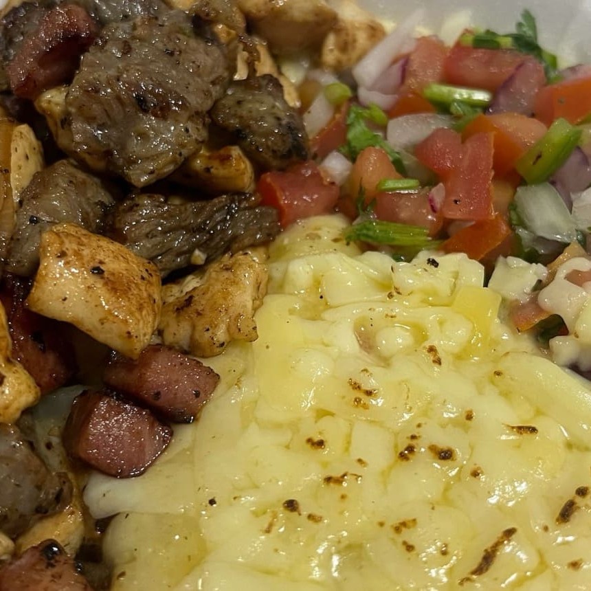 Delicioso Pirão de aipim com queijo, frango, carne do sol e calabresa.