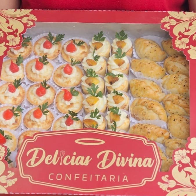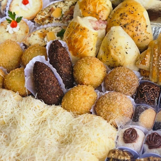 Onde compõe – 10 Docinhos (brigadeiro, casadinho, brigadeiro de Ninho com Nutella, bombom Romeu e julieta, bombom de nozes. – 10 Pães Delícia (5 com recheio Catupiry, 5 com recheio de frango) – 20 Salgados (10 Fritos é 10 assados) enroladinho misto, barquete mista, empada de frango, esfirra de carne, bolinho de bacalhau, folhado de frango, coxinha, quibe, boliviano e bolinho de bacalhau.