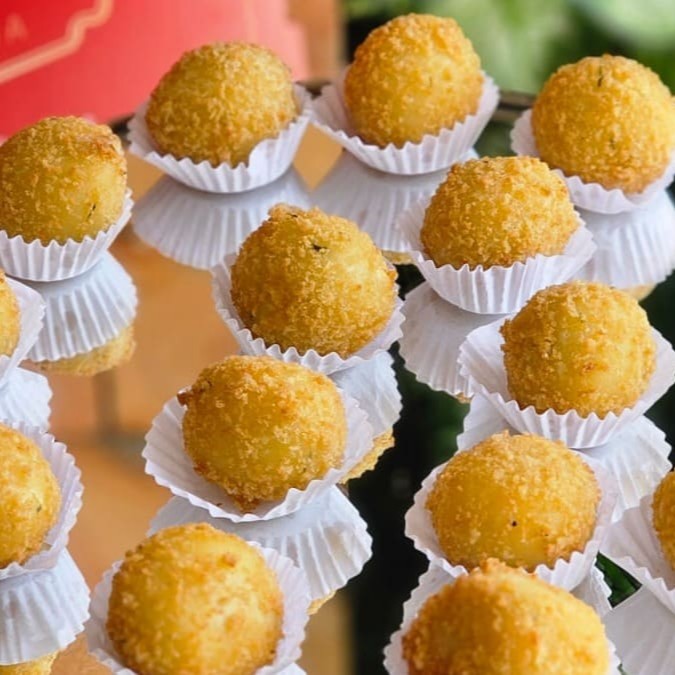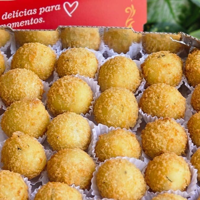 Delicioso bolinho de bacalhau empanado na farinha panko pesa 30g a unidade