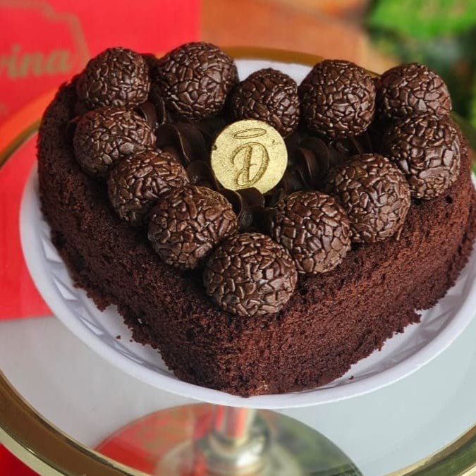 Um delicioso bolo de chocolate em formato de coração com cobertura de chocolate e com 12 brigadeiros em cima serve até 5 pessoas no diâmetro de 15x5 cm.
