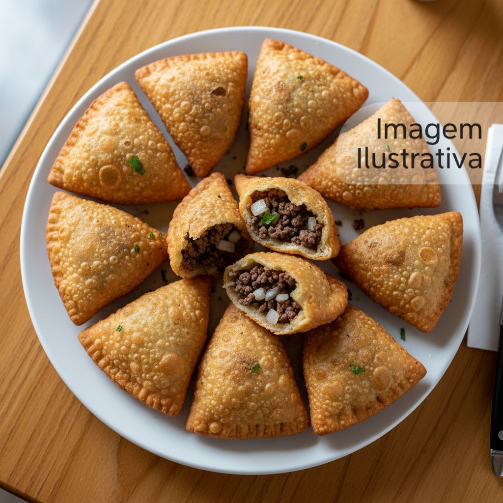 Delicioso pastel recheado com carne moída temperada e cebola picada, frito até ficar crocante.