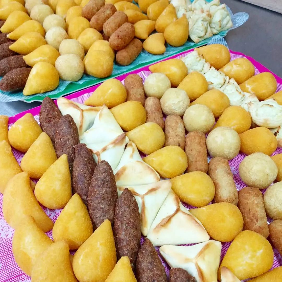 Aprecie 40 coxinhas, 30 kibes, 30 croquete de calabresa, 30 risoles misto, 20 bolivianos.