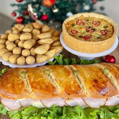 1 torta de frango tamanho M, 30 coxinhas, 30 kibes, 25 risoles misto e 25 croquetes de calabresa.