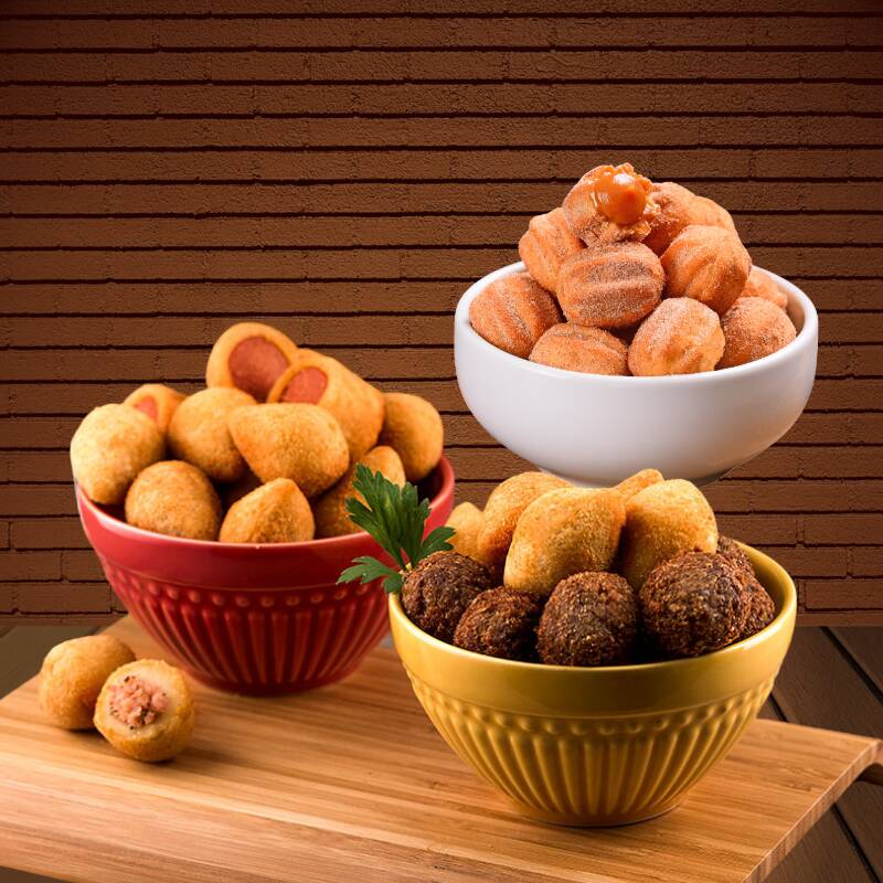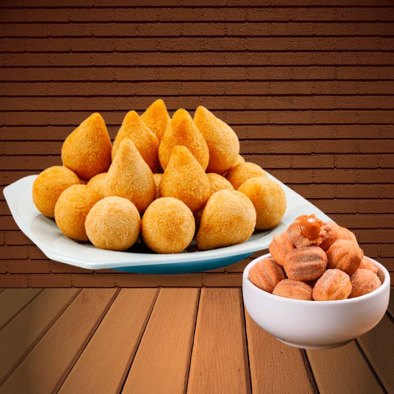 Porção generosa com 50 salgados fritos (20g cada), quentinhos e crocantes, com recheios que derretem na boca. Para adoçar ainda mais, 25 mini churros (20g cada), recheados com doce de leite cremoso, perfeitos para encerrar com chave de ouro. É a pedida perfeita para compartilhar ou se deliciar sozinho!