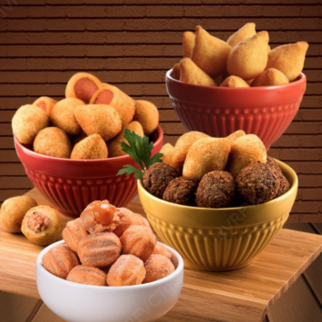 Porção generosa com 25 salgados fritos (20g cada), quentinhos e crocantes, com recheios que derretem na boca. Para adoçar ainda mais, 15 mini churros (20g cada) recheados com doce de leite cremoso, perfeitos para encerrar com chave de ouro. É a pedida perfeita para compartilhar ou se deliciar sozinho!