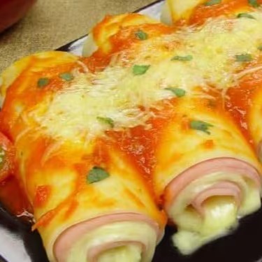 É feito de molho de tomate, mussarela gratinada com queijo parmesão.