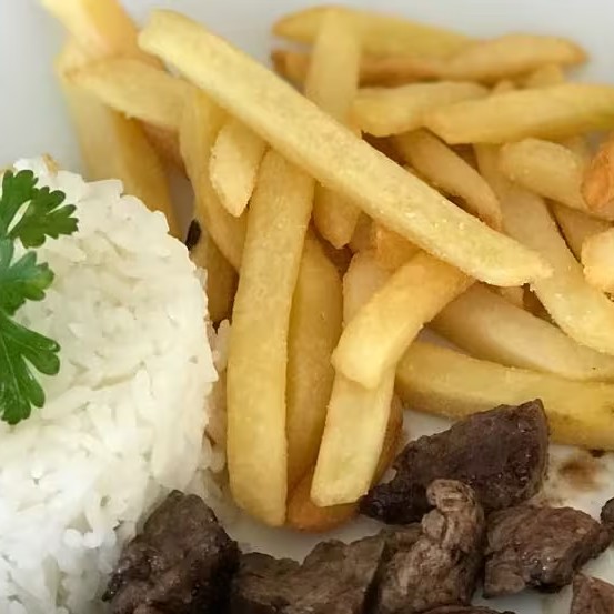 Carne do sol acebolada com queijo coalho, arroz e Batata fritas