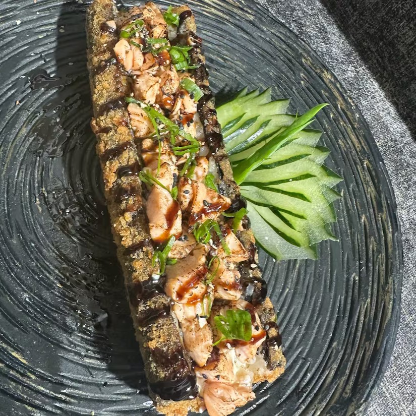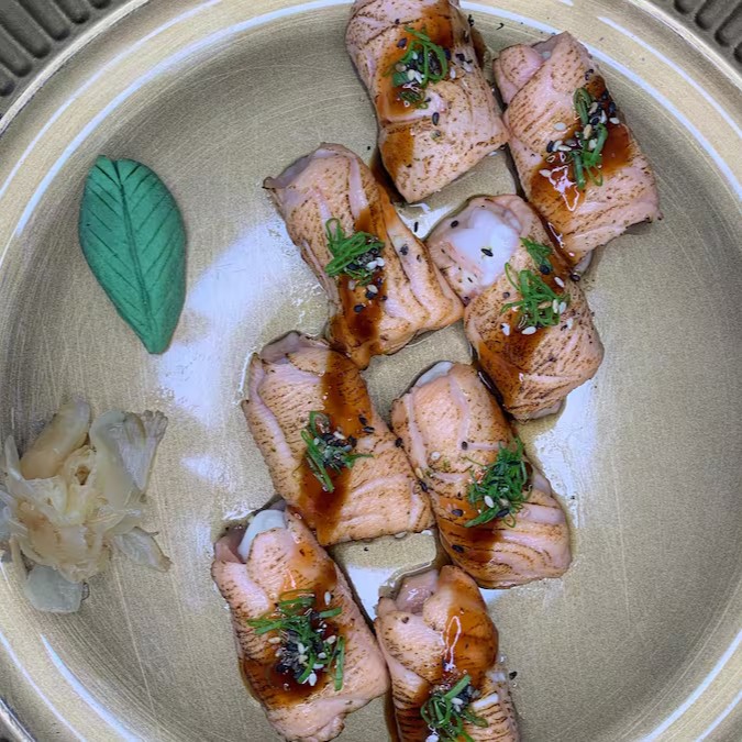8 Diamond maki especial (lâmina de Salmão envolto no camarão com um toque de creme chesse e levemente Flambado)