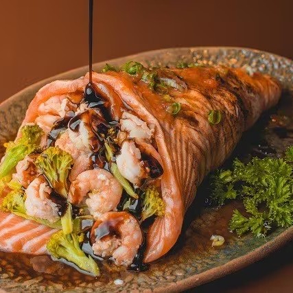 Lâmina de Salmão envolto no camarão com creme chesse, levemente flambado com um toque de molho especial do chef