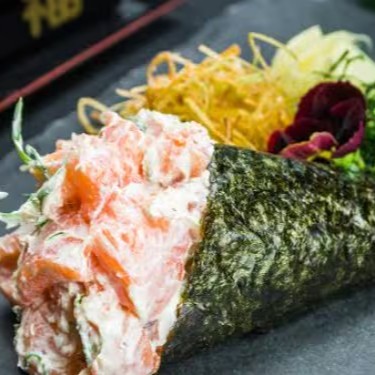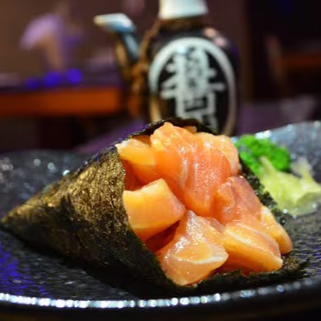 Salmão e Camarão cortado em cubos com uma leve pitada cebolinha envolto na alga com arroz e creme chesse