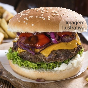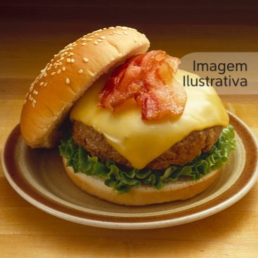 Pão, hambúrguer, bacon, queijo, presunto, milho e salada
