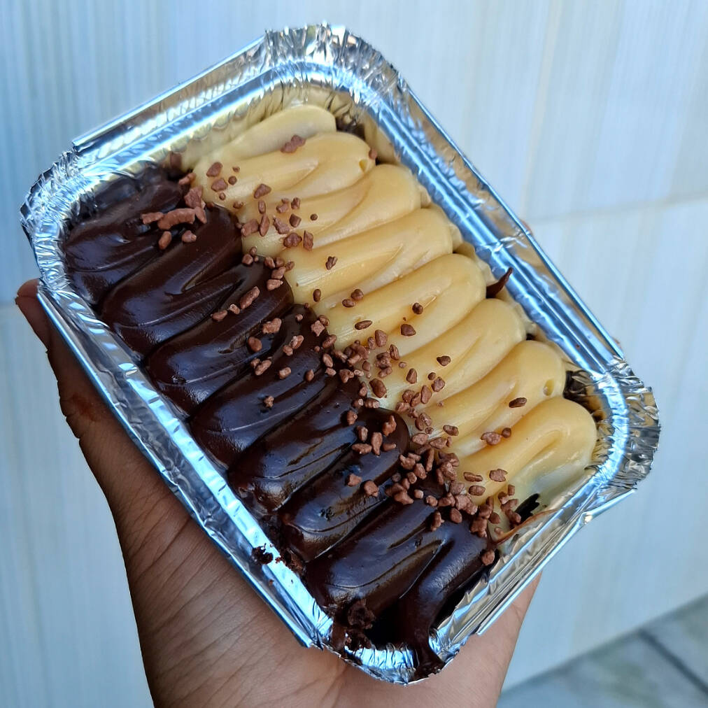 Brownie servido na marmita com dois sabores de cobertura.