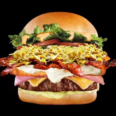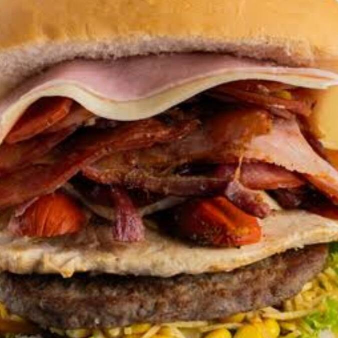 Pão ,2 carnes hambúrguer , bacon duplicado , calabresa duplicado , ovo duplicado , queijo duplicado, presunto duplicado , batata palha , cheddar , milho, evilha e salada