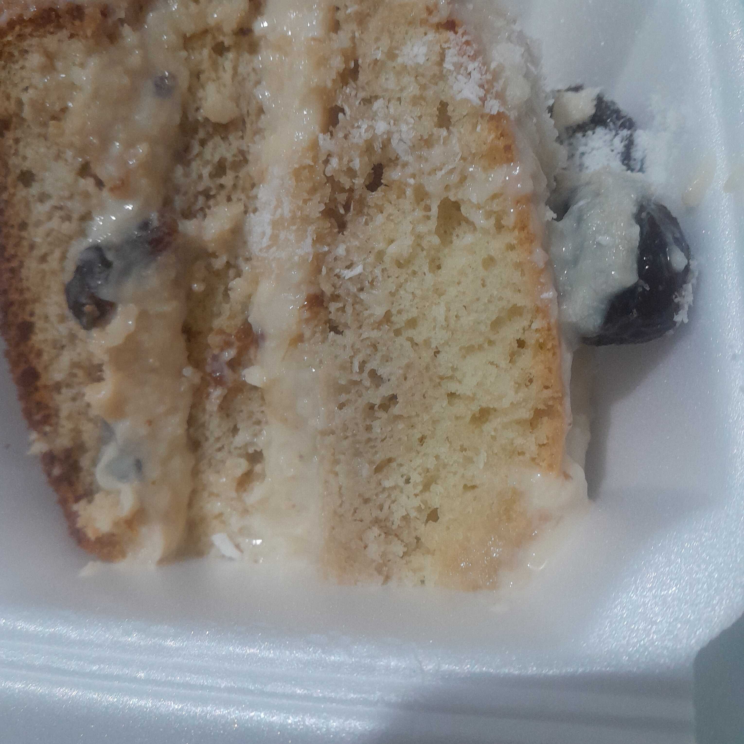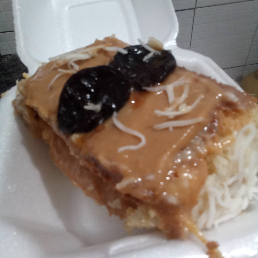 Massa branca, recheio de beijinho c/ doce de leite e bolo gelado.