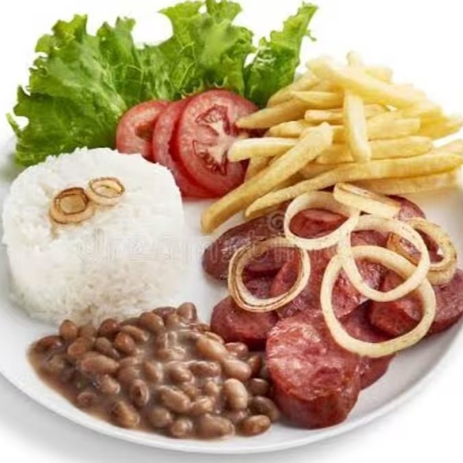 Também está incluso arroz branco e um delicioso feijão de caldo temperado.
