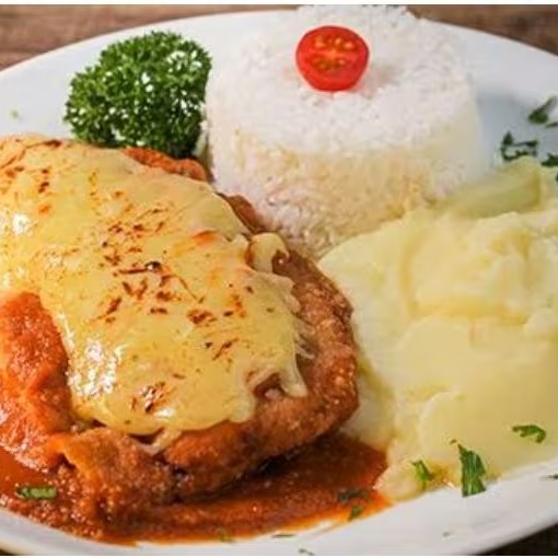 Um dos mais pedidos! Delicioso Parmegiana de frango, feito Filé de peito, coberto com fatias de queijo e regado com um delicioso molho de tomate artesanal. Acompanha arroz branco e purê de batata.