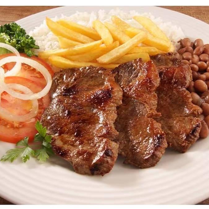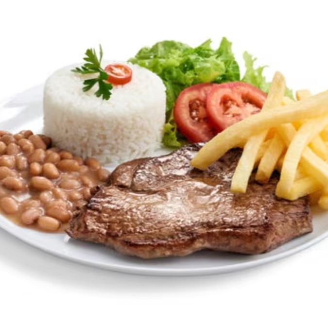 Aquele delicioso Bife suculento feito com filé de alcatra, inclusos 3 acompanhamentos clássicos: Arroz e feijão de caldo e uma saladinha verde deliciosa.