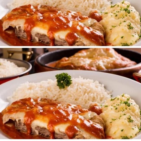 Um delicioso e suculento Parmegiana de carne, feito com filé de alcatra coberto com fatias de queijo e um maravilhoso molho de tomate caseiro. Acompanha arroz branco e purê de batata.