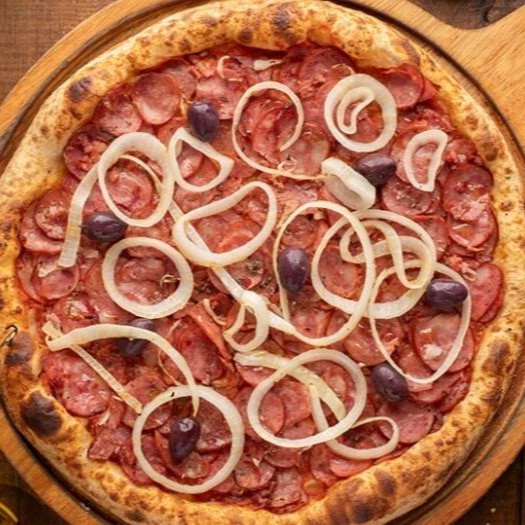 Molho de tomate, mozzarela, calabresa, cebola e orégano