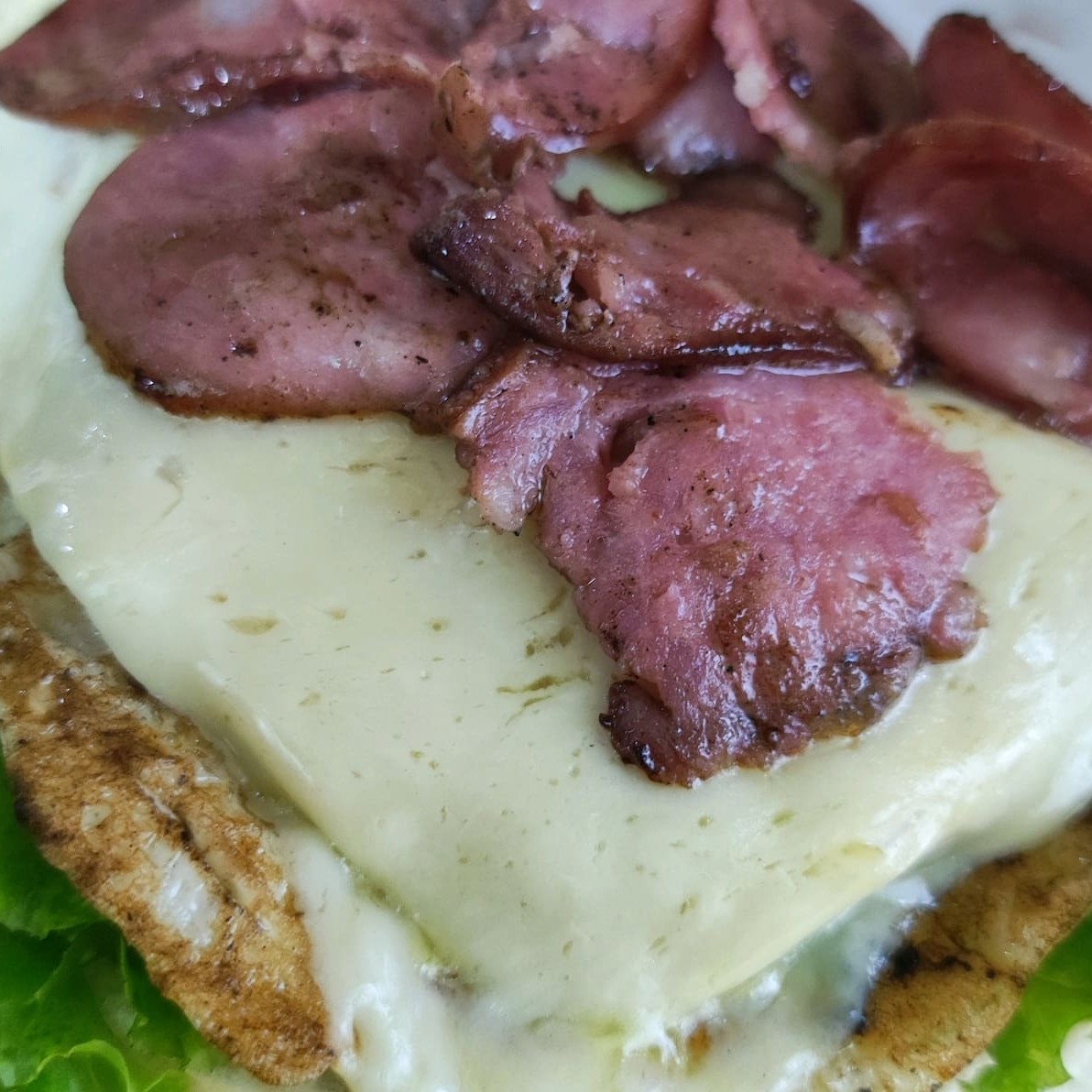 Pão, ovo, queijo, presunto, alface, tomate, catchup, maionese, barbecue , cheddar e batata palha