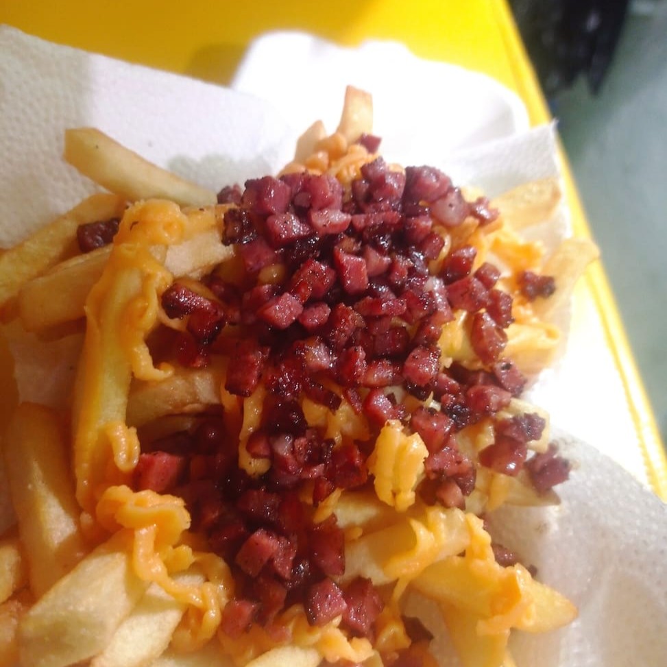 Batata Frita Com Cheddar E Calabresa.