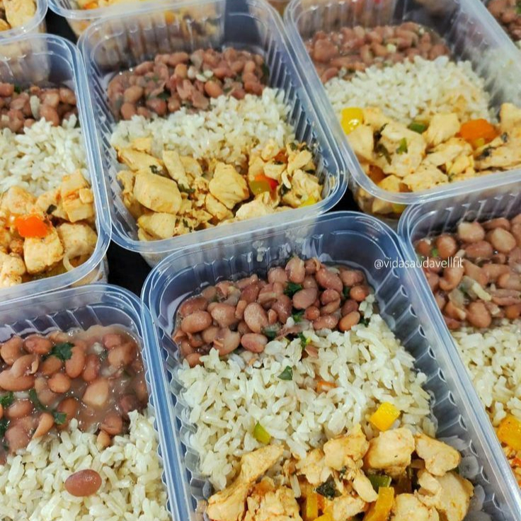 Deliciosa marmita de frango com legumes, arroz e feijão sem embutidos, só temperado! 350g cada!