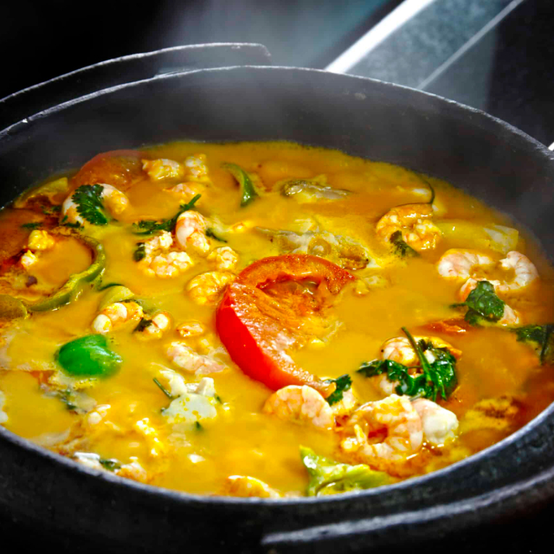 A moqueca de Marisco com camarão 500g - é uma deliciosa receita típica da culinária baiana, que é feita com mariscos, camarões, tomates, cebolas, coentro e azeite de dendê. Essa mistura de ingredientes é colocada em uma panela e cozinhada lentamente, resultando em um prato saboroso e aromático que é servido com arroz branco e farofa de dendê + molho lambão e refri 230ml