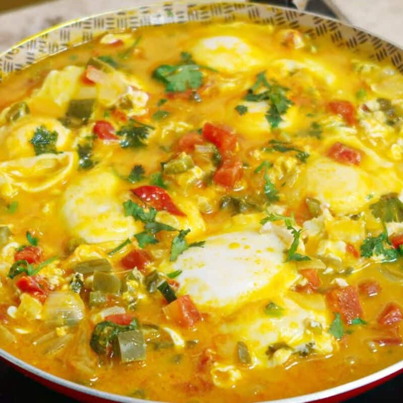 Tradicional moqueca de ovos com marisco, bem temperada! Acompanha arroz branco e molho lambão á parte!