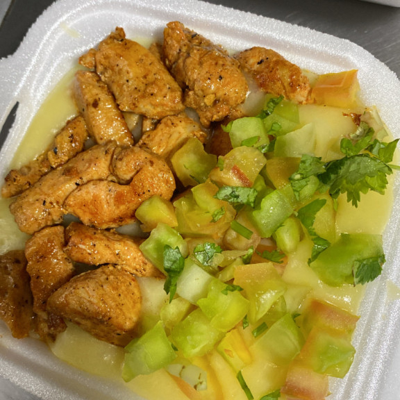 Pirão de aipim com filé de frango grelhado e salada vinagrete 350g (P)