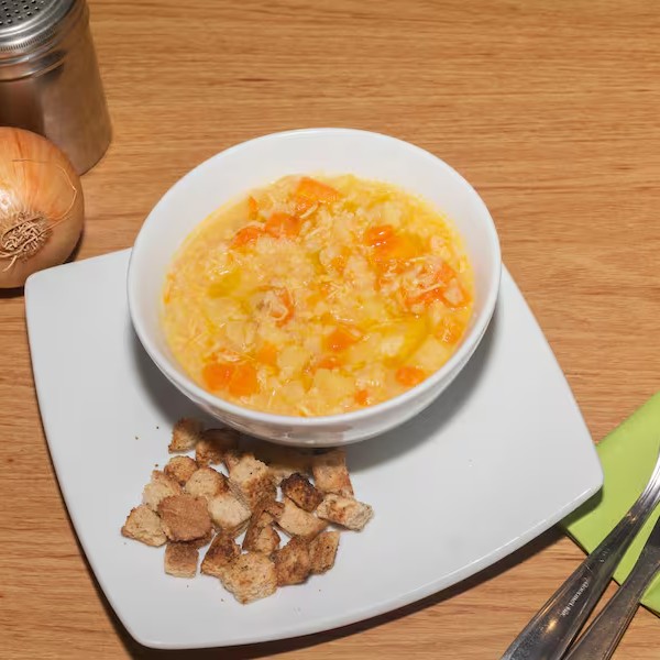 Preferência nacional também conhecida como canjinha de galinha, possui peito de frango desfiado, arroz integral e legumes (cebola,alho, cenoura e batata). Acompanha crótons integral.