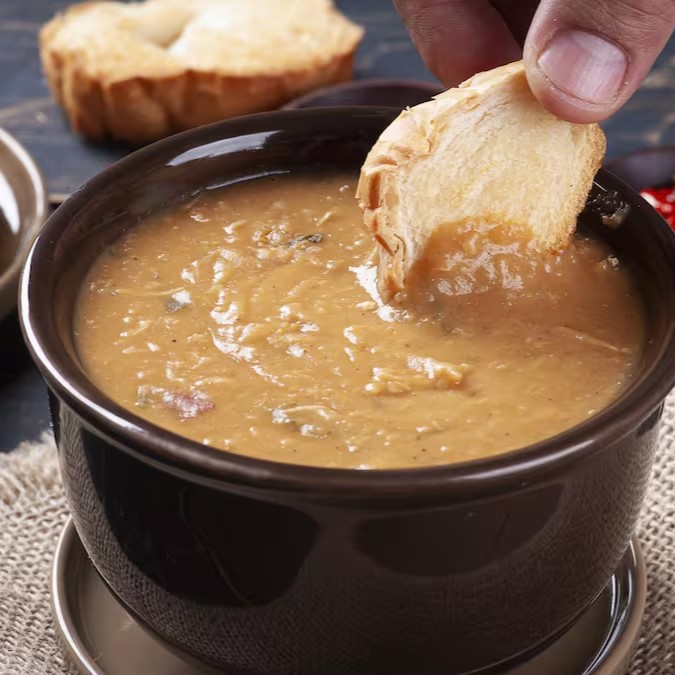 Rica em ferro, combina feijão marrom com leve tempero de louro, alho e cebola. Acompanha cróutons integral.