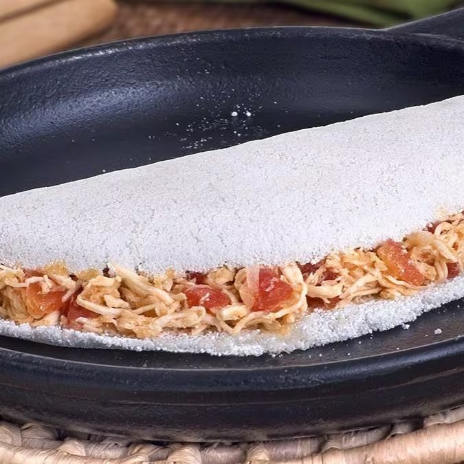 Tapioca de frango com tomate em cubos e queijo mussarela.