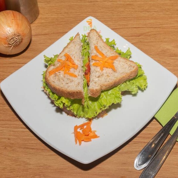Pão multigrano, pasta de frango feita com maionese light, finalizado com alface, tomate e cenoura.