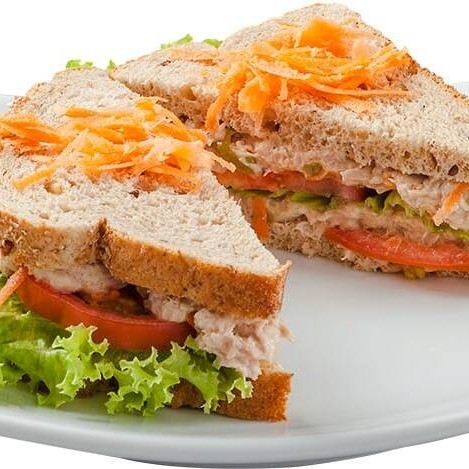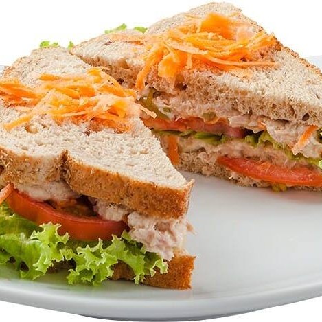 Pão multigrano, pasta de atum feita com maionese light , finalizado com alface, tomate e cenoura.