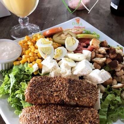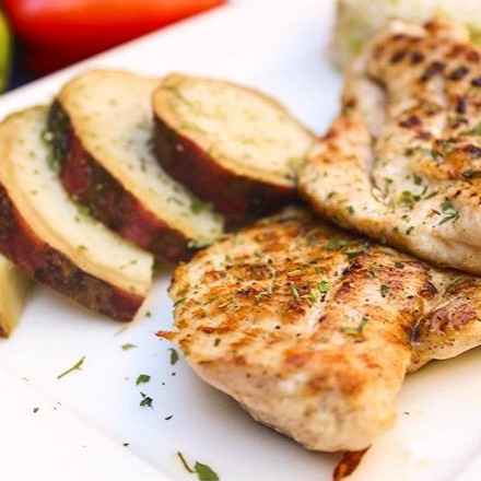 Nos rendemos à batata doce porque, além do baixo índice glicêmico, ela é rica em fibras, ferro, potássio, vitamina a, c e e. Este prato é indicado para todas as dietas, é completo pois contem frango grelhado, batata doce e mix verde (alface,pepino e rúcula).