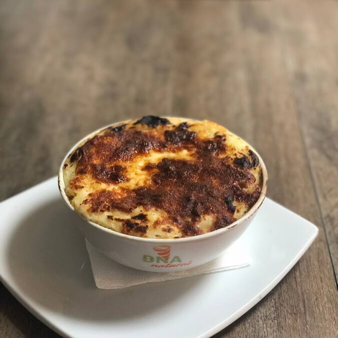 Massa feita com batata doce e leite desnatado, recheado com frango em tiras (100g) +tomate frescos+ queijo para gratinar, acompanha salada mix de alface, tomate e cenoura. Excelente opção para quem quer um carboidrato de alta complexidade e um fornecimento de energia prolongado.